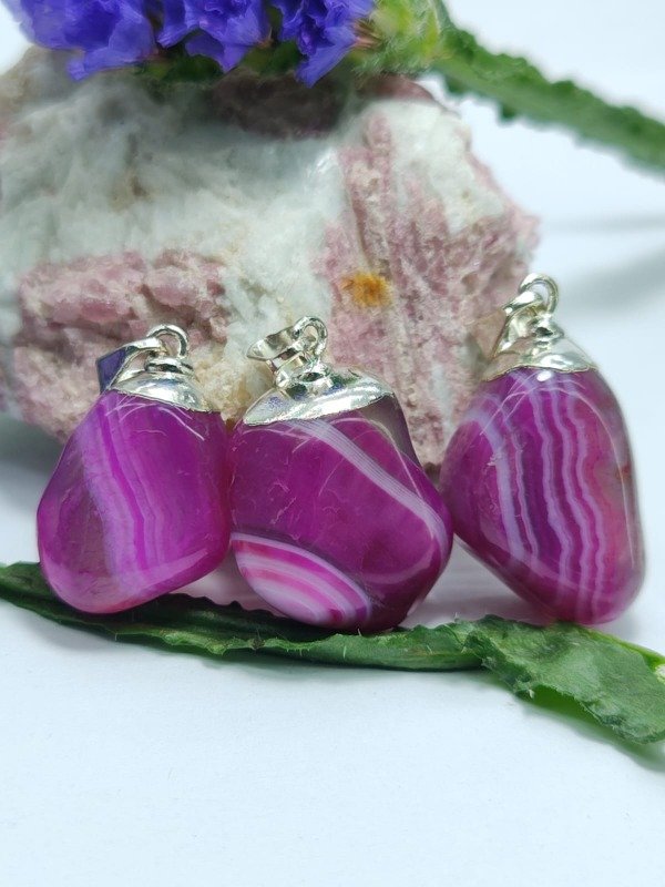 Este dije presenta una ágata rosa natural, enmarcada con un delicado baño en plata, que realza el brillo de la piedra y aporta un acabado sofisticado y versátil, ideal para complementar cualquier estilo.