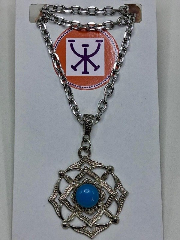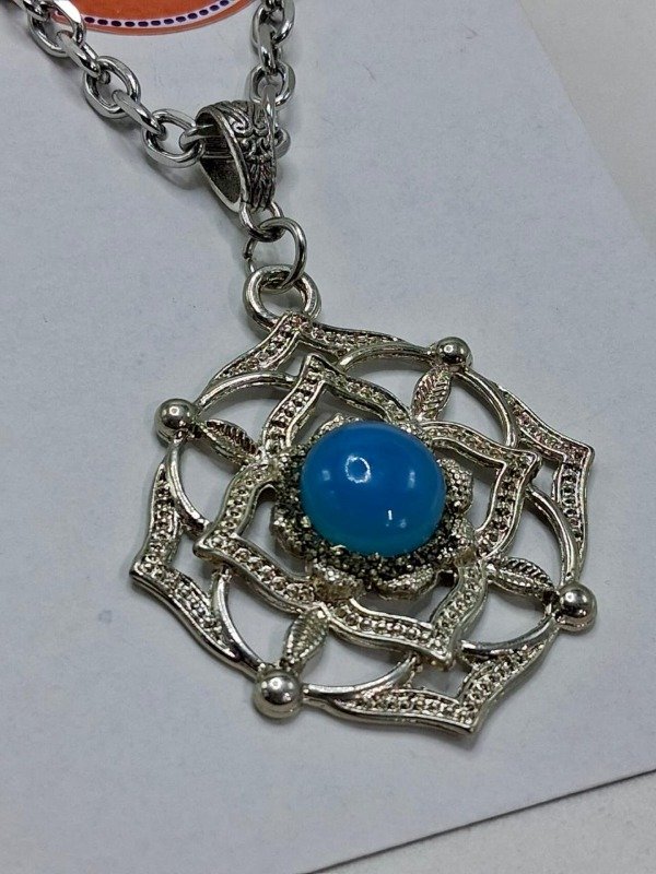 Dije de aleación baño en plata Agata Azul con polvo de pirita. Cadena de acero quirúrgico de 50cm.