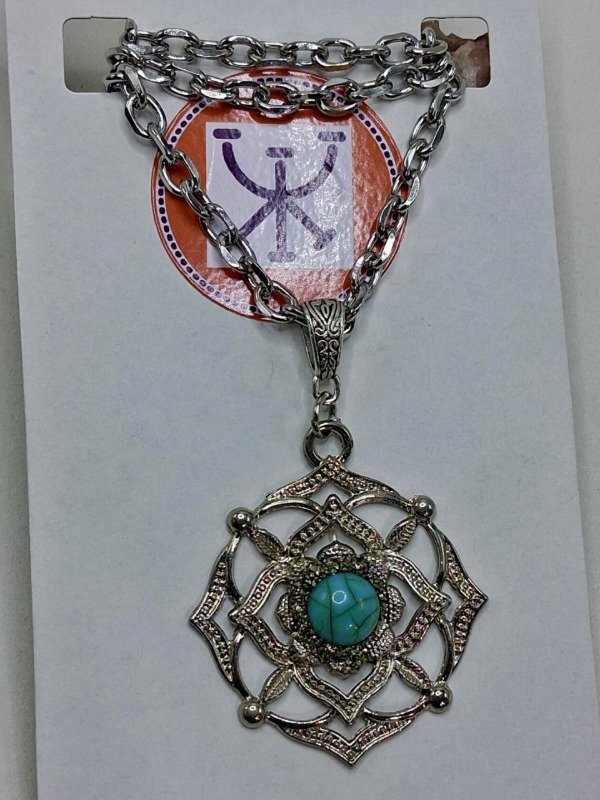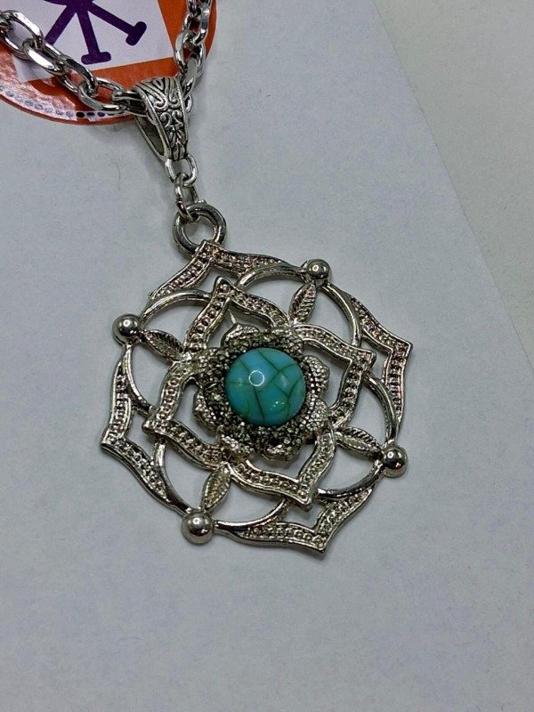 Dije de aleación baño en plata Turquesita con polvo de pirita. Cadena de acero quirúrgico de 50cm.