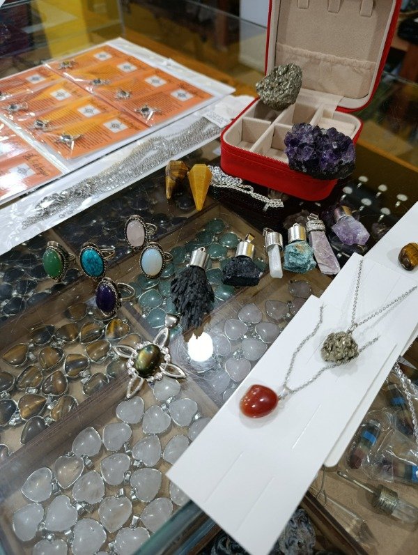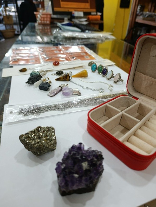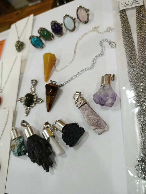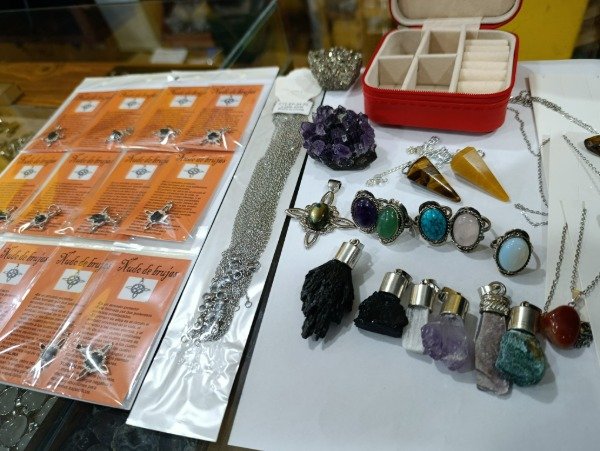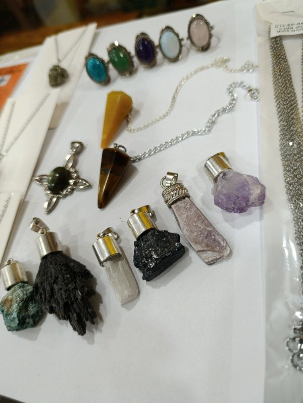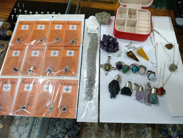 En este kit vas a poder encontrar un blister de nudo de bruja con 12 unidades un pack de cadena de 10 unidades dos péndulos cinco anillos de alpaca seis dijes básicos de guarda simple un nudo de bruja grande de labradorita un estuche para colocar anillos o dijes pequeños y agregamos tres dijes que ya vienen incluidos con cadenas de acero son perforados y de regalo te vas a llevar una pirita y una amatista en bruto!