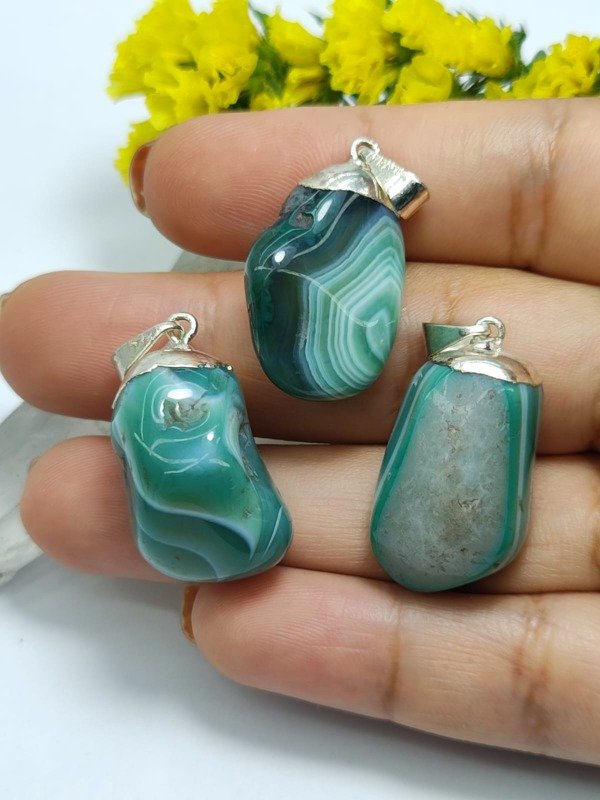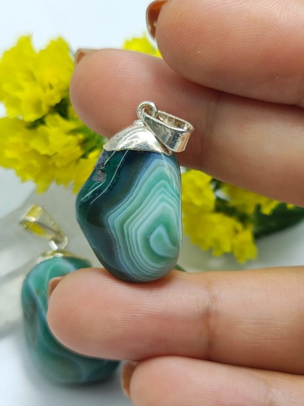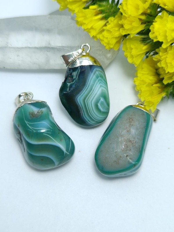 Este dije presenta una ágata verde natural, enmarcada con un delicado baño en plata, que realza el brillo de la piedra y aporta un acabado sofisticado y versátil, ideal para complementar cualquier estilo.