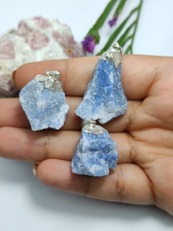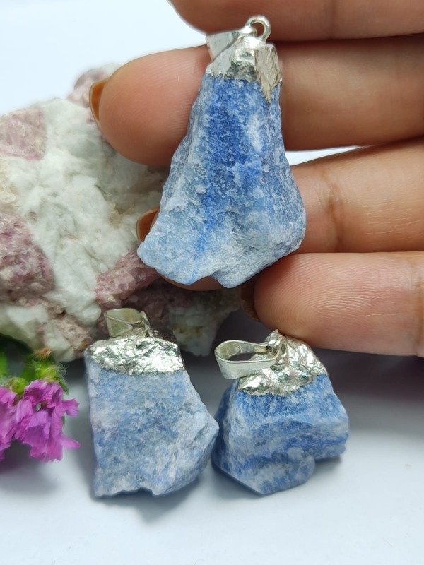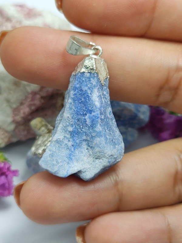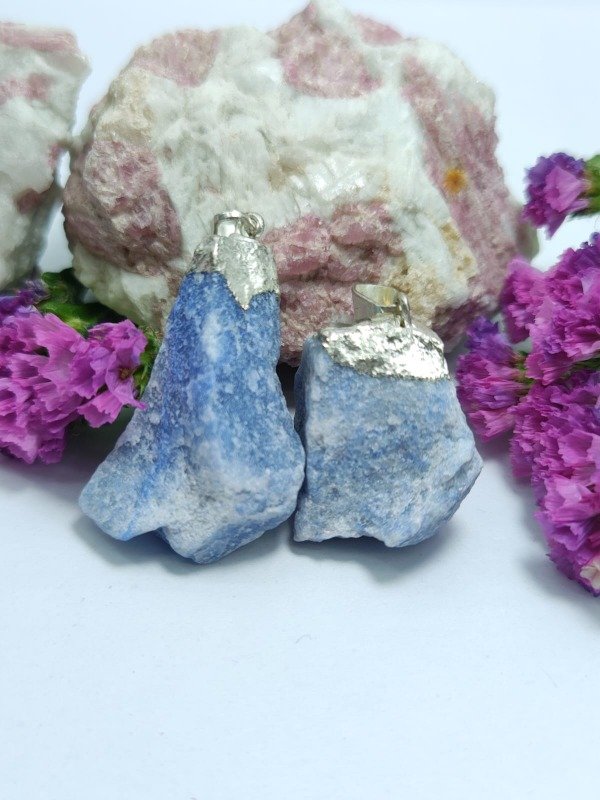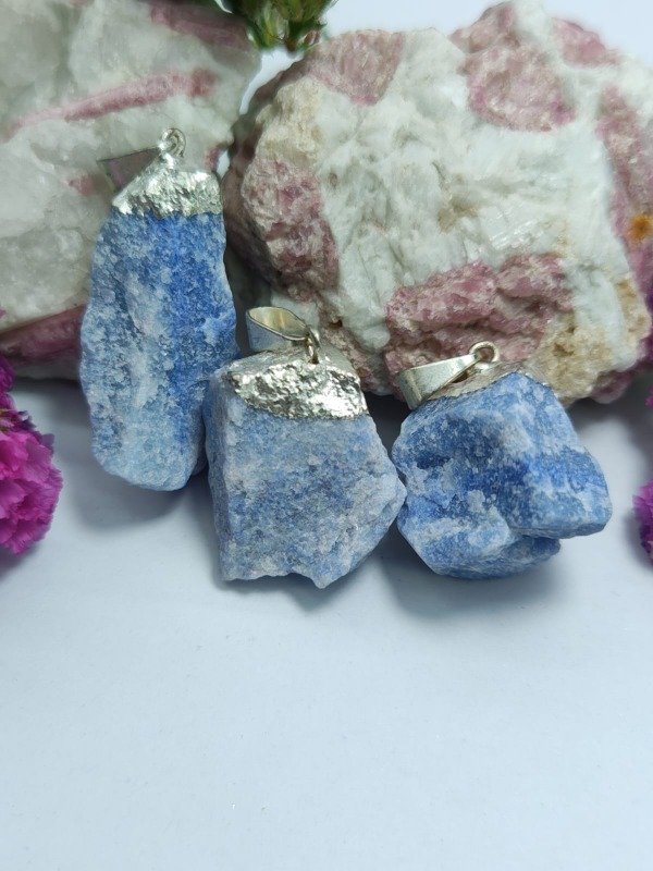 Este dije presenta un cuarzo azul, enmarcado con un delicado baño en plata, que realza el brillo de la piedra y aporta un acabado sofisticado y versátil, ideal para complementar cualquier estilo.