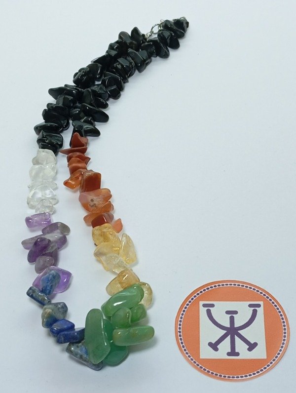 Collar de siete chakras con escallas, cuarzo cristal, amatista, lapizlazuli, cuarzo verde, citrino,cornalina, jaspe rojo y onix negro en su terminación.