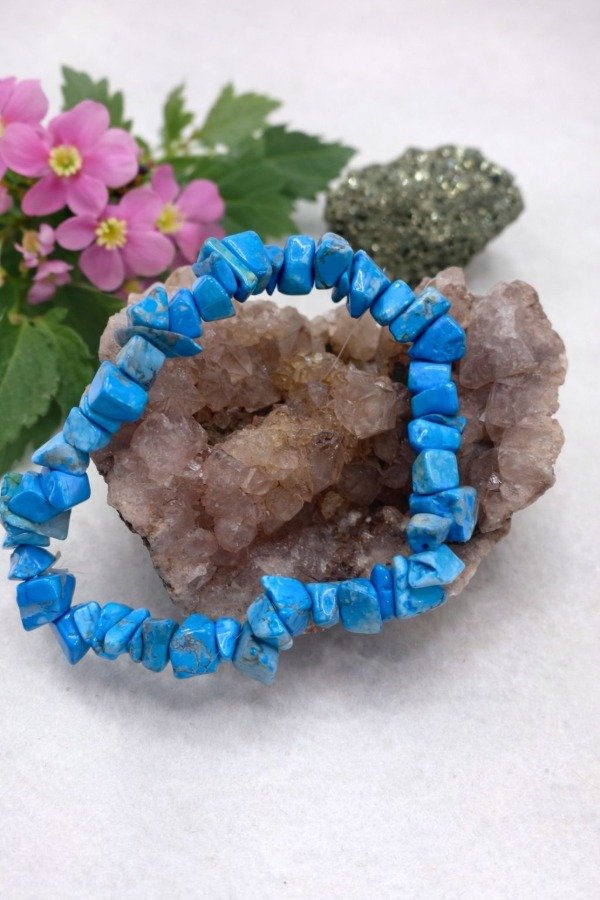 La turquesa reconstituida esta compuesta por polvo de Turquesa real mezclados con Howlita blanca, esta técnica permite estabilizar y solidificar el material, haciéndolo más duradero.